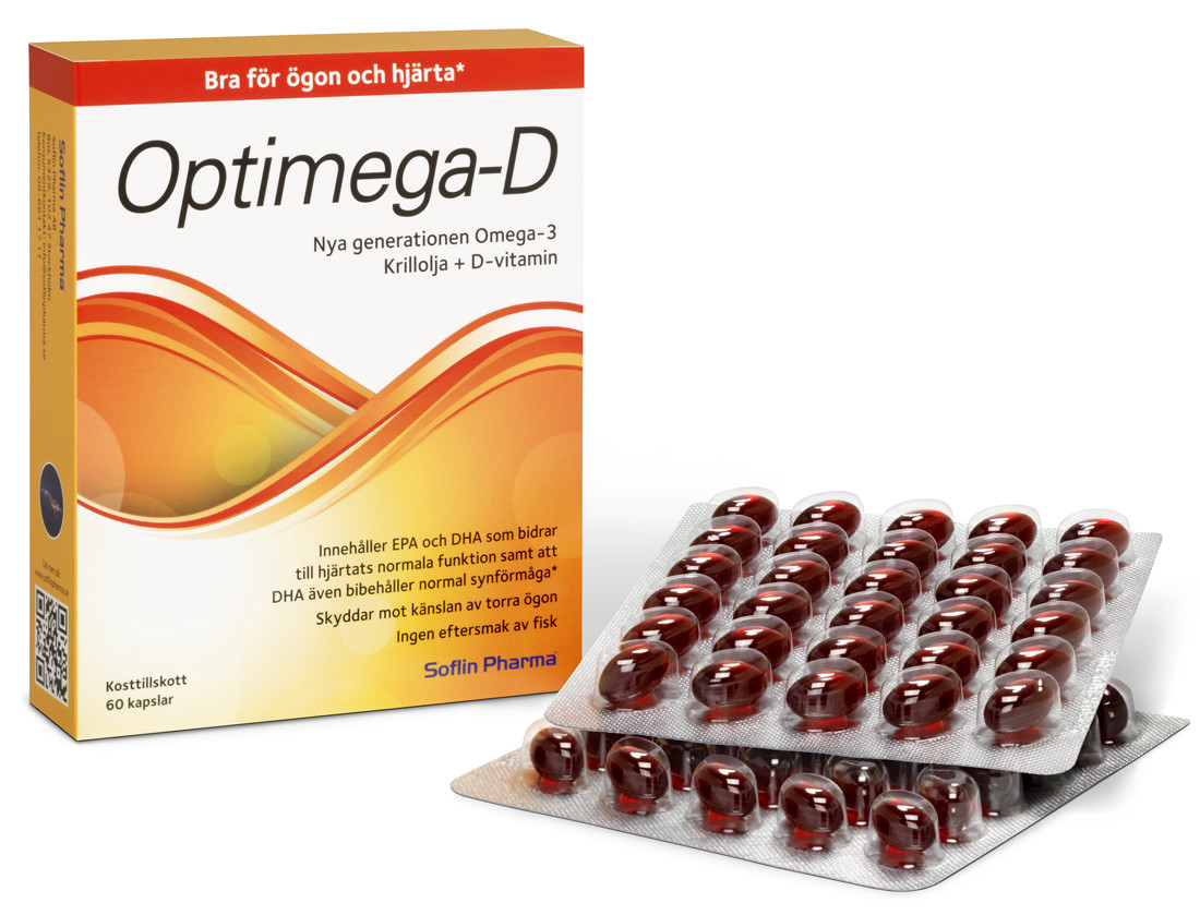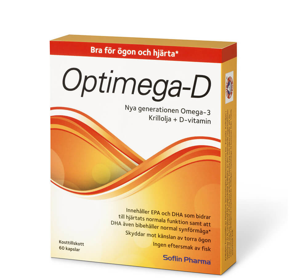 Dosering Optimega-D: 1-2 kapslar/dag eller efter läkares ordination. Ingen eftersmak av fisk. En ask innehåller 60 lättsvalda kapslar. 1 kapsel innehåller 500 mg krillolja + 20 mikrogram (800 IE) D3-vitamin.